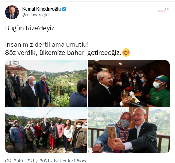CHP Genel Başkanı Kemal Kılıçdaroğlu, bugün Rize’de yurttaşlarla bir araya geldi. Kılıçdaroğlu, Rize'deki temaslarına ilişkin sosyal medyadan paylaşım yaptı. Kılıçdaroğlu’nun paylaşımı şöyle: