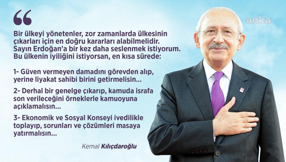 Kılıçdaroğlu, “Güven vermeyen damadını görevden alıp, yerine liyakat sahibi birini getirmelisin. Derhal bir genelge çıkarıp, kamuda israfa son verileceğini örneklerle kamuoyuna açıklamalısın. Ekonomik ve Sosyal Konseyi ivedilikle toplayıp, sorunları ve çözümleri masaya yatırmalısın” dedi.