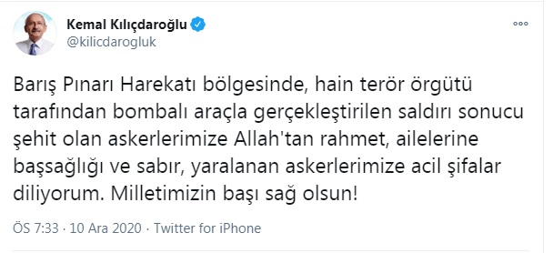 CHP Genel Başkanı Kemal Kılıçdaroğlu, Barış Pınarı Harekatı bölgesinde bulunan Suriye'nin Rasulayn ilçesinde yol kontrol noktasına terör örgütü PKK/YPG tarafından düzenlenen bombalı saldırıda şehit olan askerler için başsağlığı mesajı yayınladı.