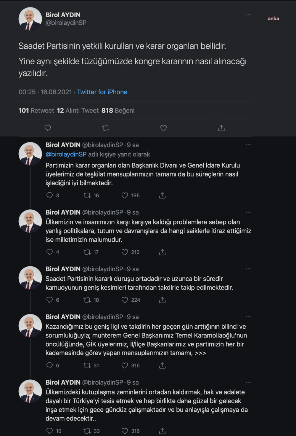 "Saadet Partisi'nin yetkili kurulları ve karar organları bellidir. Yine aynı şekilde tüzüğümüzde kongre kararının nasıl alınacağı yazılıdır. Partimizin karar organları olan Başkanlık Divanı ve Genel İdare Kurulu üyelerimiz de teşkilat mensuplarımızın tamamı da bu süreçlerin nasıl işlediğini iyi bilmektedir. Ülkemizin ve insanımızın karşı karşıya kaldığı problemlere sebep olan yanlış politikalara, tutum ve davranışlara da hangi saiklerle itiraz ettiğimiz ise milletimizin malumudur. Saadet Partisinin kararlı duruşu ortadadır ve uzunca bir süredir kamuoyunun geniş kesimleri tarafından takdirle takip edilmektedir. Kazandığımız bu geniş ilgi ve takdirin her geçen gün arttığının bilinci ve sorumluluğuyla; muhterem Genel Başkanımız Temel Karamollaoğlu'nun öncülüğünde, GİK üyelerimiz, il/ilçe başkanlarımız ve partimizin her bir kademesinde görev yapan mensuplarımızın tamamı, ülkemizdeki kutuplaşma zeminlerini ortadan kaldırmak, hak ve adalete dayalı bir Türkiye’yi tesis etmek ve hep birlikte daha güzel bir gelecek inşa etmek için gece gündüz çalışmaktadır ve bu anlayışla çalışmaya da devam edecektir."