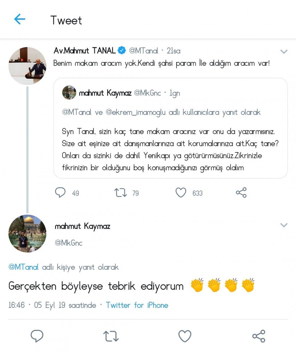 Bunun üzerine CHP’li Tanal, AKP yanlısı Twitter kullanıcısına “Benim makam aracım yok. Kendi şahsi param ile aldığım aracım var!” cevabını verdi.