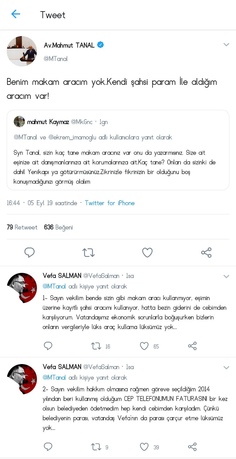 CHP İstanbul Milletvekili Mahmut Tanal ile Twitter kullanıcısı  arasındaki makam aracı tartışmasına, belediye tarafından kiralanan makam aracını iade edip, eşinin üzerine kayıtlı özel aracını belediyeye getirerek makam aracı yapan CHP’li Yalova Belediye Başkanı Vefa Salman da katıldı.