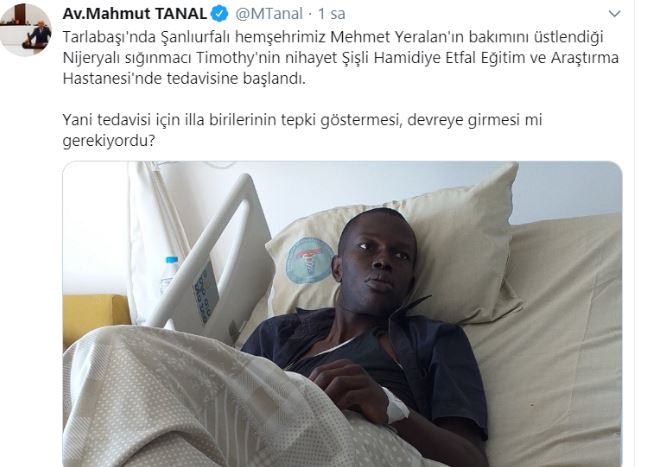 Konuyla ilgili Twitter hesabından yeni bir açıklama yapan CHP’li Tanal, “Tarlabaşı'nda Şanlıurfalı hemşehrimiz Mehmet Yeralan'ın bakımını üstlendiği Nijeryalı sığınmacı Timothy'nin nihayet Şişli Hamidiye Etfal Eğitim ve Araştırma Hastanesi'nde tedavisine başlandı. Yani tedavisi için illa birilerinin tepki göstermesi, devreye girmesi mi gerekiyordu?” değerlendirmesinde bulundu.