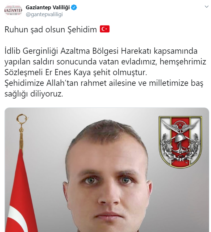 Gaziantep Valiliği, İdlib Gerginliği Azaltma Bölgesi'nde 1 askerimizin şehit olduğunu duyurdu. Şehit olan sözleşmeli erin Enes Kaya olduğu öğrenildi.