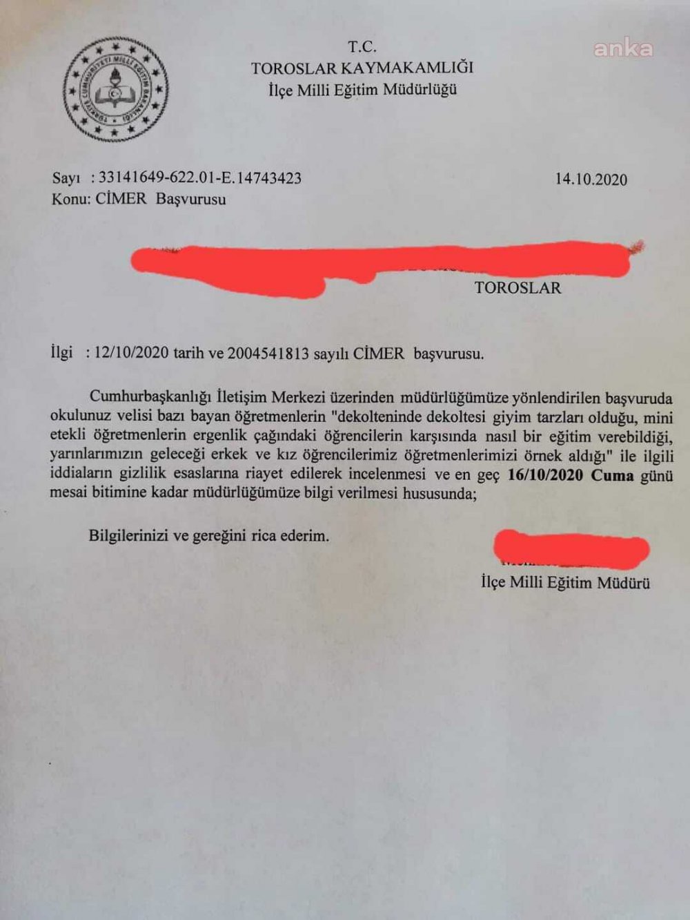 Mersin’in Toroslar ilçesinde; Hüseyin Güvercin Ortaokulu velilerinden birisi uzaktan eğitim veren öğretmenlerin kılık kıyafeti ile ilgili olarak CİMER’e şikayette bulundu. Milli Eğitim bakanlığı da bu başvuruyu Toroslar İlçe Milli Eğitim Müdürlüğü’ne iletti. İlçe Milli Eğitim Müdürlüğü’nün ise şikayette yer alan ifadeleri olduğu gibi kendi resmi yazısına aktararak okula göndermesi tepki çekti. Müdürlüğün yazısında şu ifadelere yer verildi: