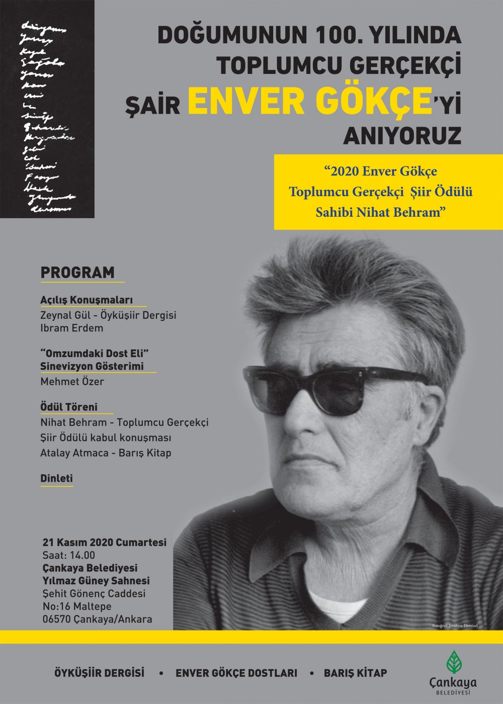 Çankaya Belediyesi. doğumunun 100. yılında ünlü şair Enver Gökçe'yi anıyor. 21 Kasım'da Çankaya Belediyesi Yılmaz Güney Sahnesi'nde gerçekleşecek etkinlikte, şairin anısına düzenlenen "Enver Gökçe Toplumcu Gerçekçi Şiir Ödülü" bu yıl Nihat Behram’a verilecek.
