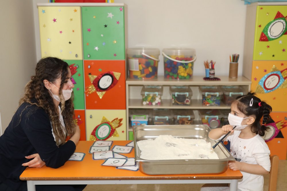 Çocukların rahat ve güvenli bir ortamda eğitimlerini almaları için her detayın düşünüldüğü kreşlerde eğitim veren öğretmenler, maskeleriyle çocuklarla belli mesafe gözeterek ilgileniyor.