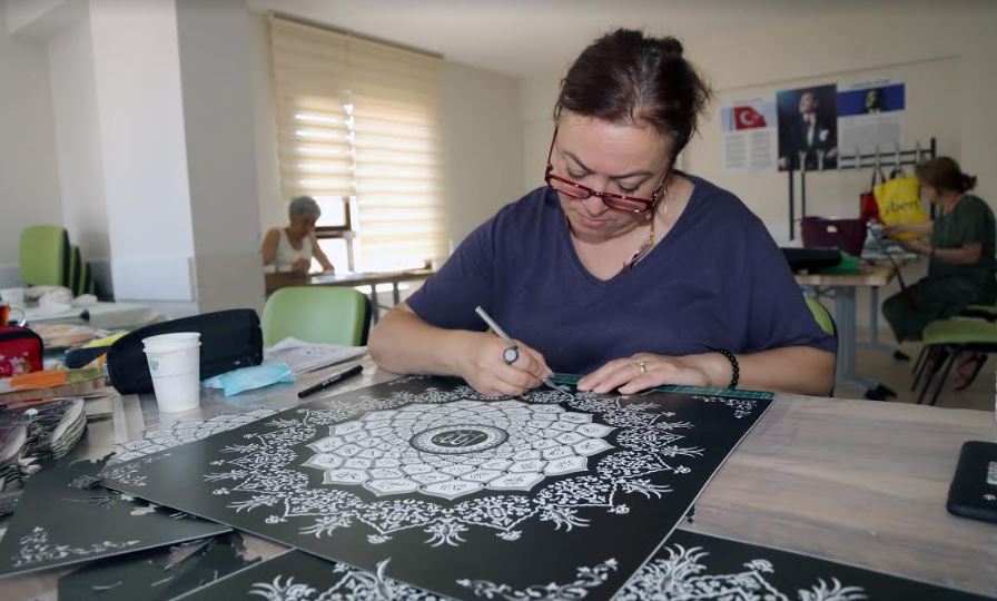 Kursa katılan kadınlar akvaryum ve mum silikon, ütü matı ile sprey vernik yordamıyla bir fotoğrafın ya da posterin tek tek kesilerek en arka plandan ön plana tekrar bir araya getirilmesiyle oluşan kağıt rölyeflere eğitmenleri Hacer Ünal’la birlikte hayat veriyorlar.