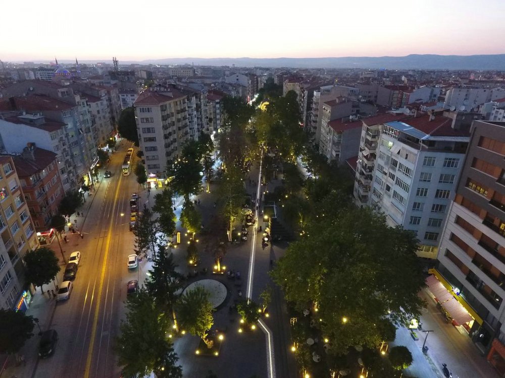 Geri dönüştürülebilir ahşap kompozit kullanılarak oluşturulan peyzaj elemanlarından, su sistemlerinden ve yoğun bitki dokusundan oluşan “yeşil yaya aksı”, Odunpazarı’ndan Porsuk Nehri’ne doğru uzanan modern ve hareketli buluşma alanları yaratıyor. Proje bu bağlantıyı kentsel ölçekte güçlendirirken, üç boyutlu topografyasıyla ziyaretçilerine kent dokusunu farklı bir bakış açısıyla deneyimlemelerini sağlıyor. Odunpazarı’nın en önemli turistik simgelerinden olan el yapımı camların gömülmesiyle oluşturan 1.2 km uzunluğundaki lineer kentsel aksı ile yerel üretimin de projenin içinde yer almasını sağlayan Hamamyolu Park ve Meydan Düzenleme Projesi -Hamamyolu Urban Deck, Odunpazarı Uluslararası Ahşap Heykel Festivali’nde tasarlanan heykellerinde yerleştirilmesiyle de kent için nitelikli bir sergi alanına dönüştürüyor. Aynı zamanda projede birçok kafe alanları, çocuk oyun alanları, ve havuzlar yer alıyor, özel olarak tasarlanan aydınlatma elemanları gibi birçok fikrin projeye katılmasıyla Hamamyolu Caddesi kentsel dokuya entegre olarak, her yaştaki kent sakinine ve ziyaretçisine ev sahipliği yapıyor.