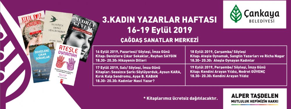 Toplumsal cinsiyet eşitliği konusundaki duyarlı çalışmaları ve önemli projeleriyle Türkiye’nin ilk “Mor Bayrak”lı yerel yönetimi olan Çankaya Belediyesi, “3. Kadın Yazarlar Haftası” nı düzenliyor. Etkinlik kapsamında alanında uzman birçok kadın yazar okurlarıyla buluşacak.